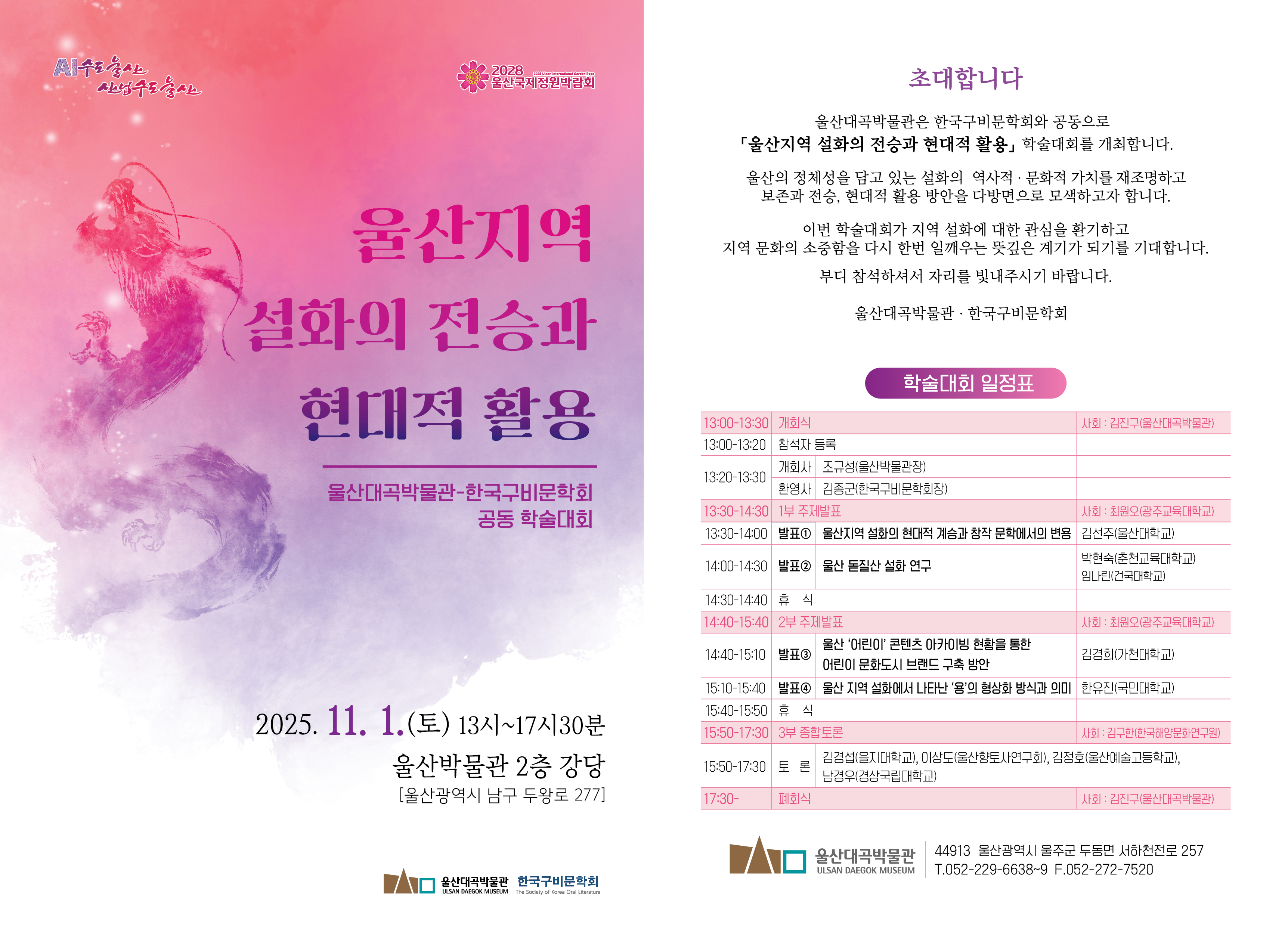 - 울산대곡박물관 ‘울산지역 설화의 전승과 현대적 활용’ 학술대회 개최 알림 및 참석 안내
