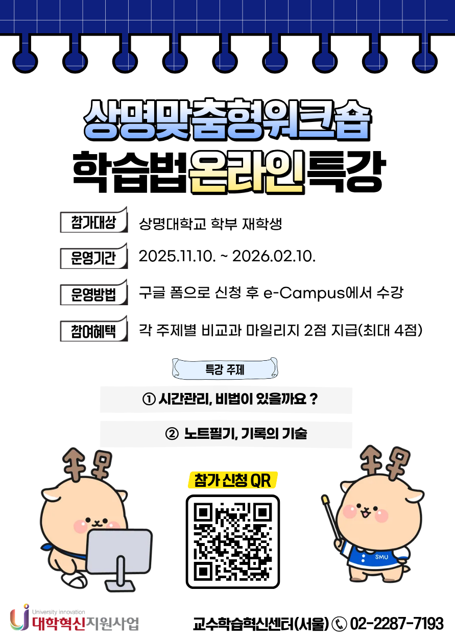 | 상명 [비교과] | [교수학습혁신센터(서울)]2025학년도 2학기 상명맞춤형워크숍_학습법 온라인 특강 |