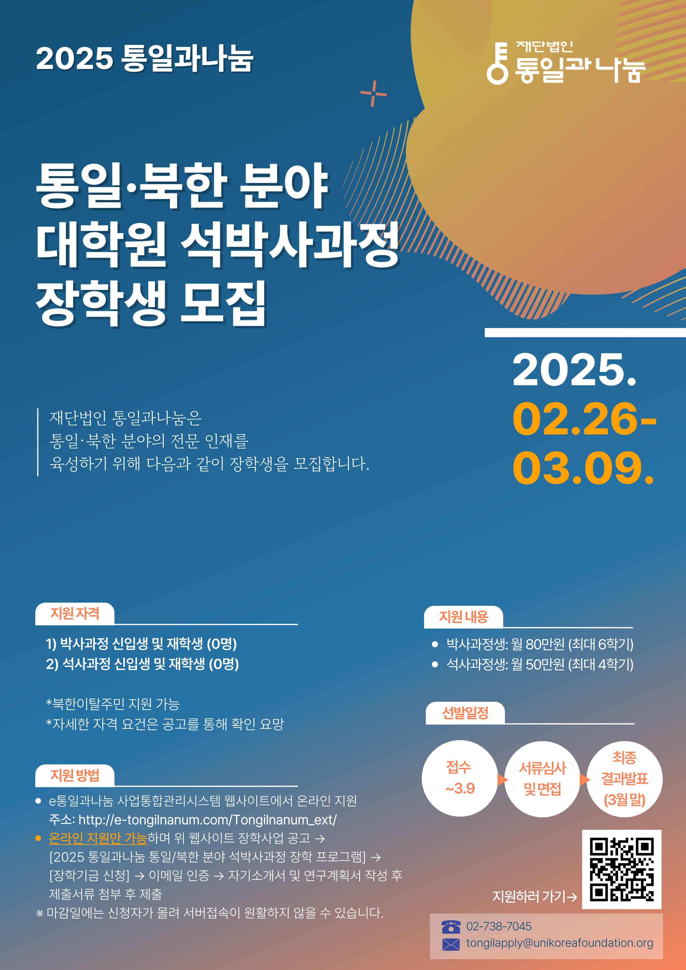 - [기타] [전체대학원] 통일·북한 분야 대학원 석박사 장학생모집
